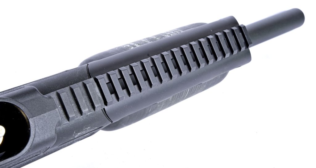 Moving even farther forwards there’s a very comfortable fore end grip, and then a long Picatinny rail on the underside to take a bipod or any other accessories you choose.