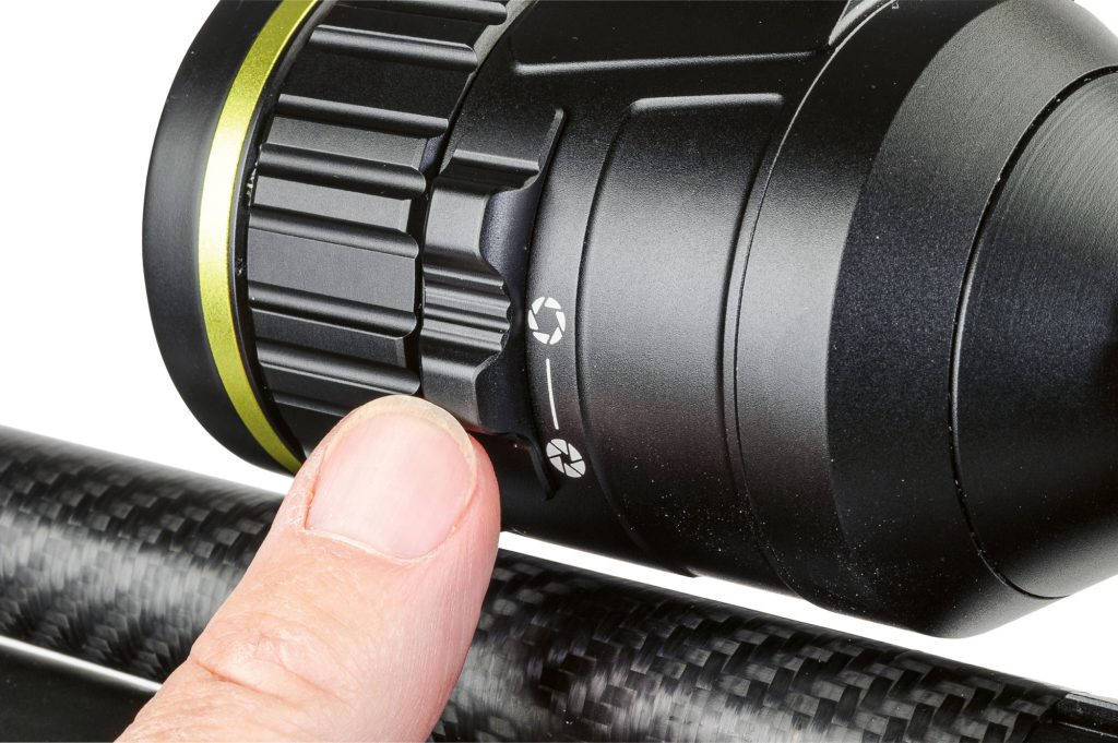 Pixfra states its V850’s objective lens is 50mm. I reckon this means focal length, though, because I measured the glass at 42mm diameter. Whatever, it includes an adjustable iris to boost the sight picture’s brightness. A glider on the left side of the objective bell lets you open (f1.2) or close (f3.0) this to suit the amount of light let in. I found this feature both extremely useful and ergonomic to operate.