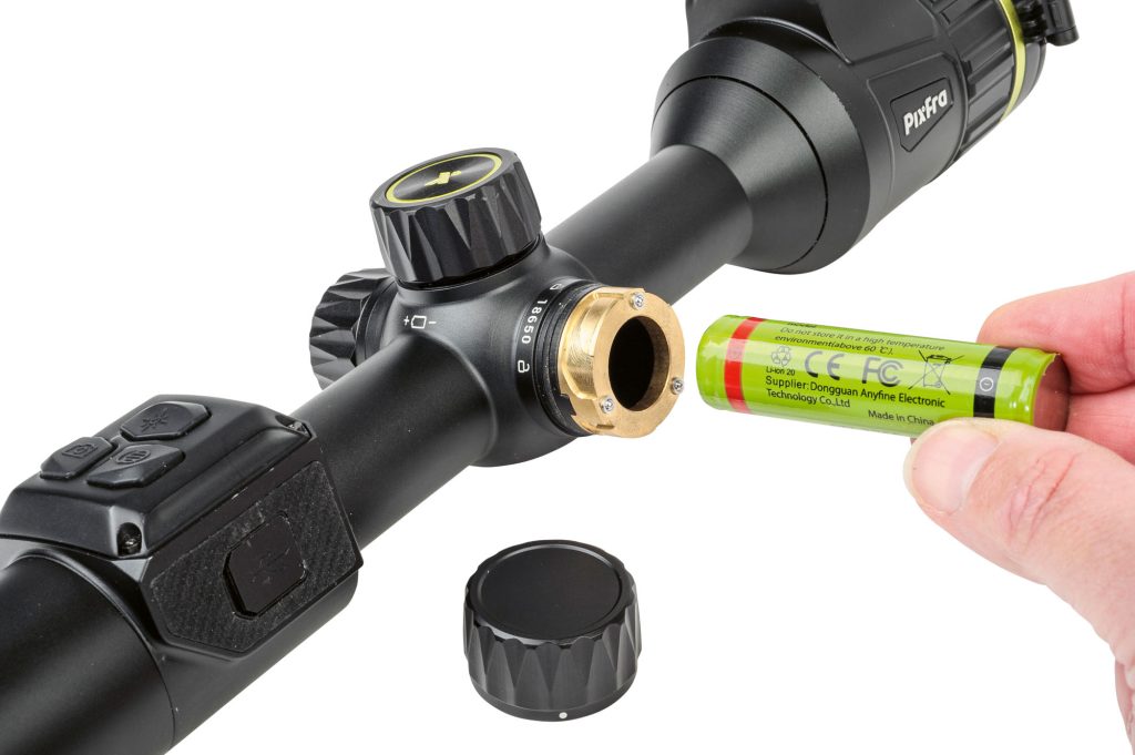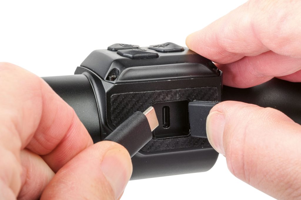 The push button on the left of the control module switches the scope on and off. Powered by one rechargeable Li-Ion 18650 battery located between the left and right “dummy” turrets , Pixfra claims up to 5.5 hours’ on time per charge. In practice, I rarely got more than 3.5 hours, especially on the colder nights. I never “ran out” of battery, though, and you get two batteries anyway. Plus a rather nifty charger, all contained in a neat semi-hardshell carry case. Via the USB-C cable, the battery can also be charged in situ.