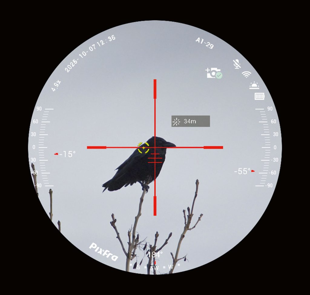But the Pixfra’s UI (user interface) goes further, offering a “Smart Ballistics” zeroing function. By inputting ballistic data, the scope will then work out how much aiming allowance is needed, based on your zero range in relation to the target’s distance established by the LRF. Cleverly, an additional aiming marker – the style of which you can choose yourself – is then overlaid on your reticle.