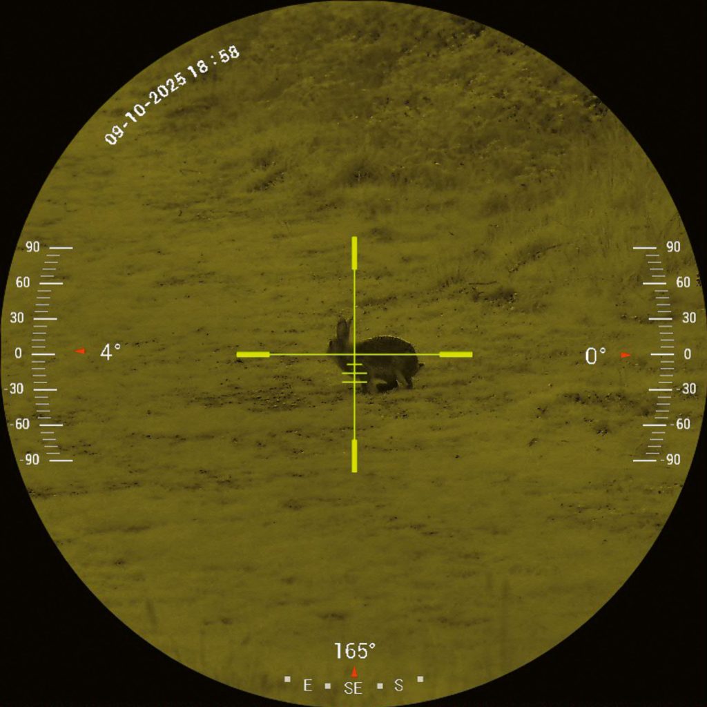 The left button on the control module’s top plate lets you capture the viewed image. Pressing it takes a photo (as you see on these pages); a longer press records a video of what you’re seeing in the eye-box. You can even set it so that a video automatically starts recording once it senses your rifle’s recoil, although this feature didn’t always work with my recoilless PCP.