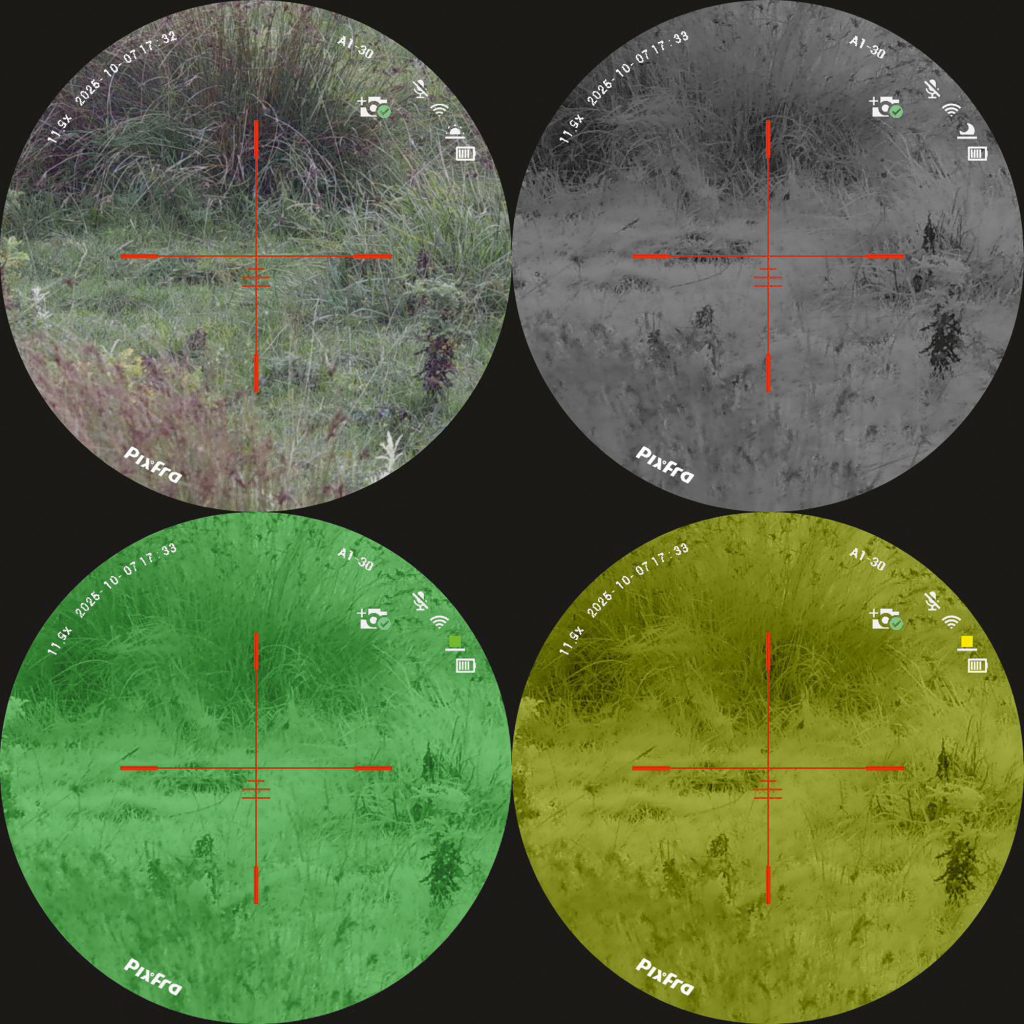 You then have options to view the scene according to the ambient lighting conditions, which you cycle through via the right push-button on top of the control module at the rear of the scope.