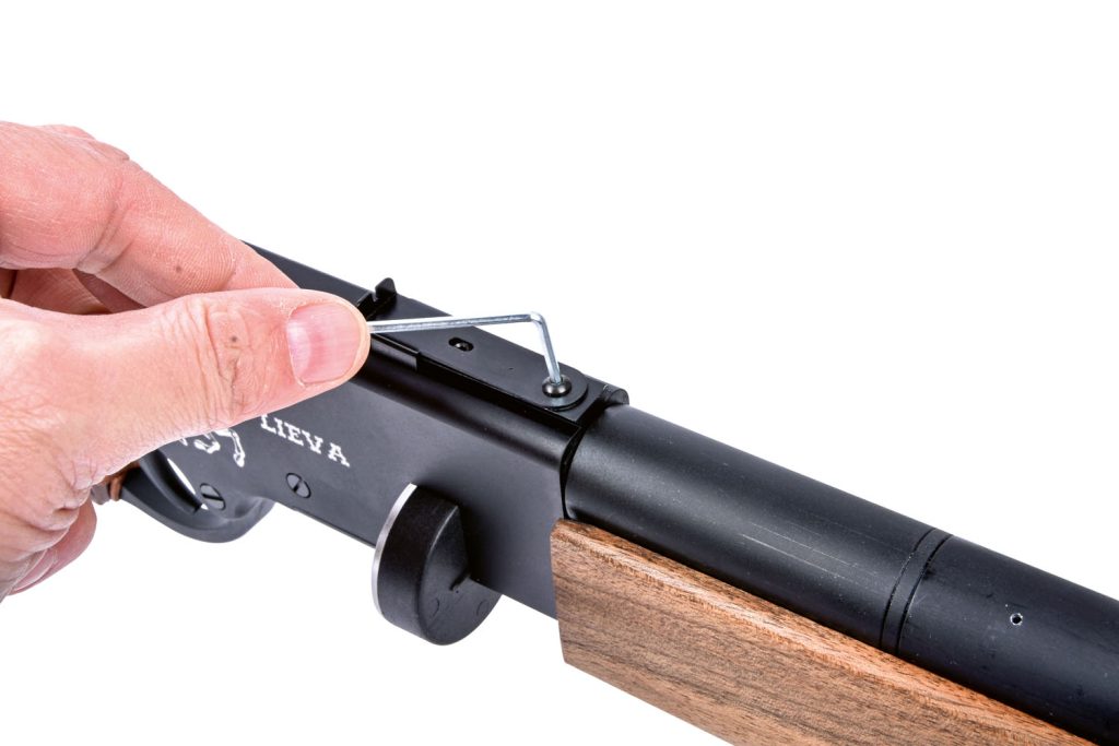 On top of the action is the other part of the open sights, which is also adjustable for height. If I’m honest, these open sights are about as basic as they come – perfectly adequate for smashing tin cans in your garden, but a quick flick with the supplied Allen key soon removes this and you’re left with a generous single dovetail rail to which you can attach a scope.