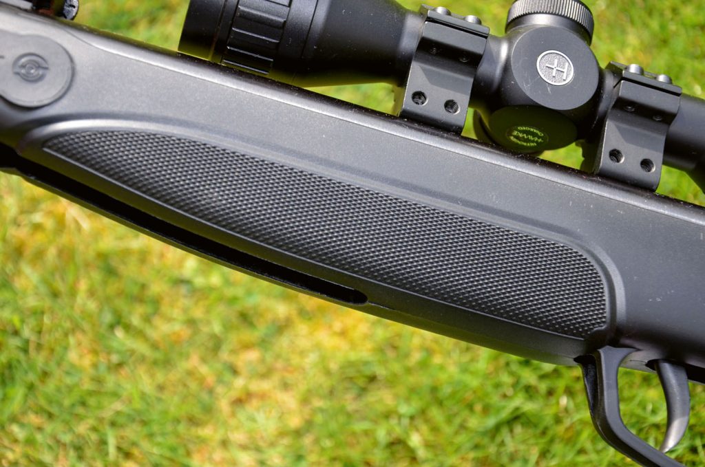 Stoeger describes the handle as an “ergonomic tactical-style stock”. The synthetic material is practical and “all-terrain,” but its real benefit is weight loss. The thumb-hole configuration and various cut-outs allow the rifle to tip the scales at a mere 4.6lbs, making it easy for any child to handle safely. Other features include: